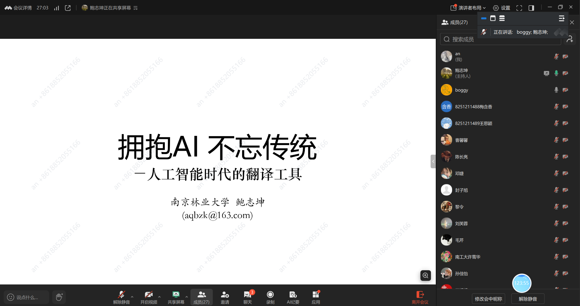 2025年9月25日下午14:00-16:00,应用语言学研究团队通过线上平台召开了2025-2026学年第一学期第一次学术交流会。本次会议由鲍贵老师主持,特别邀请南京林业大学翻译学鲍志坤教授作了题为“拥抱AI,不忘传统——人工智能时代的翻译工具”的学术讲座。