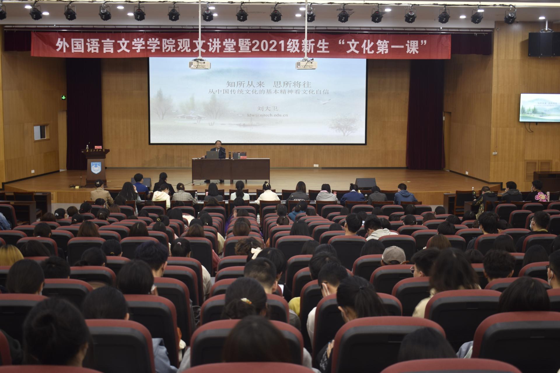 国民之魂,文以化之;国家之神,文以铸之。为激励广大青年学子继承中国传统文化,弘扬时代精神,11月3日下午,leyu·乐鱼(中国)体育官方网站特邀校党委常委、党委办公室主任刘大卫老师做客第三期“观文讲堂”暨2021级新生“文化第一课”。“观文讲堂”由院党委书记弋鹏主持,院党委副书记高洁、辅导员王鑫及200余名新生参加了讲座。
