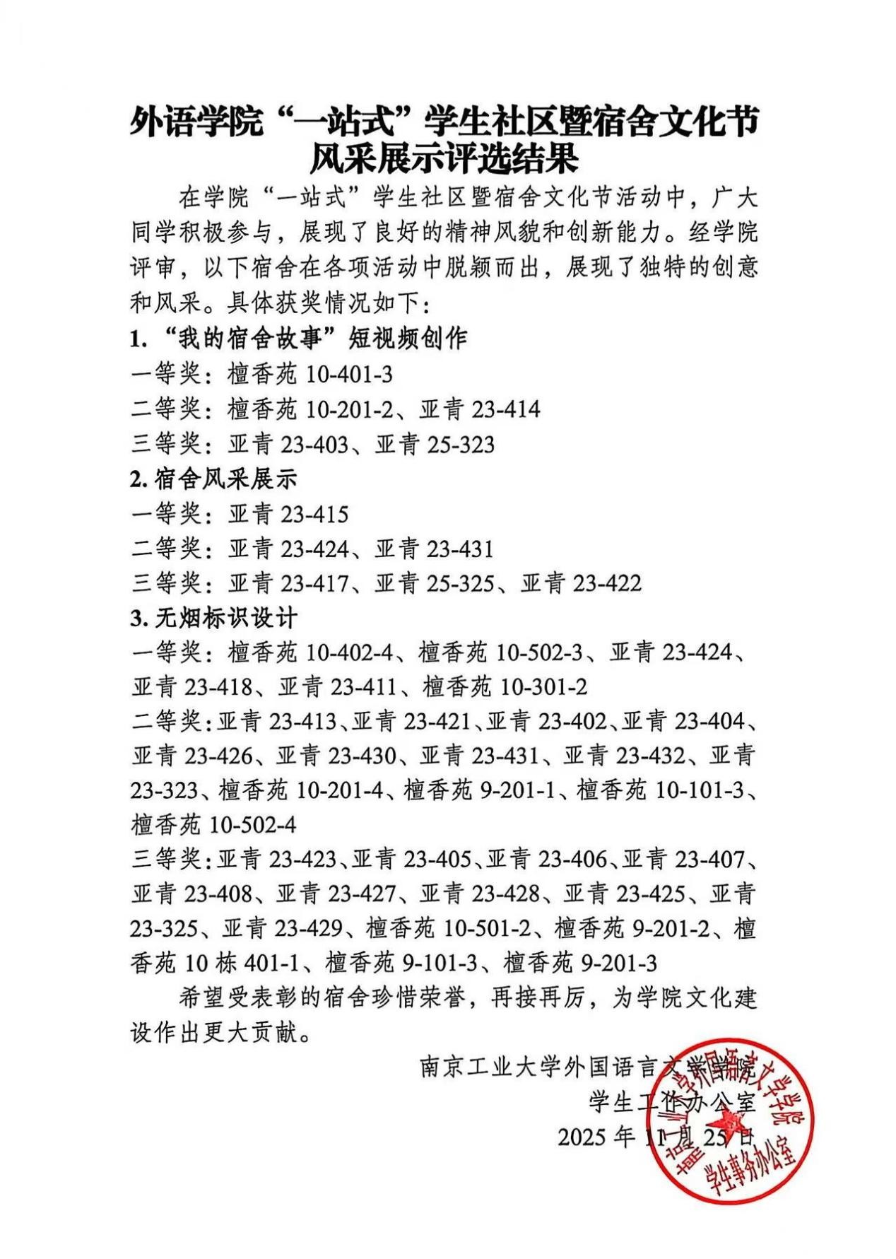 在校级“一站式”学生社区风采展示暨“宿舍文化月”活动中,外语学院的同学积极参与,在各项比赛中展现了良好的精神风貌和创新能力,学院评选出一系列兼具创意性、独特性和代表性的优秀作品并推报校学工处。